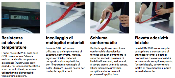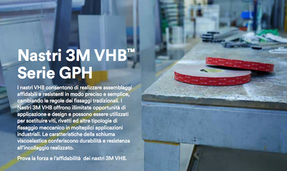 I nastri 3M VHB sono da oltre 30 anni la migliore alterativa ai fissaggi meccanici. Infatti, mentre viti e rivetti “uniscono” i materiali in un singolo punto, il nastro in schiuma acrilica 3M VHB consente di unire stabilmente un substrato ad un altro distribuendo il carico attraverso l’intera lunghezza del giunto, garantendo al tempo stesso un fissaggio quasi invisibile, senza segni di saldatura o rivettatura. I nastri 3M VHB della serie GPH sono ideali per applicazioni in molteplici mercati industriali, e in particolare per elettrodomestici, segnaletica, allestimento veicoli speciali e lavorazione del metallo.