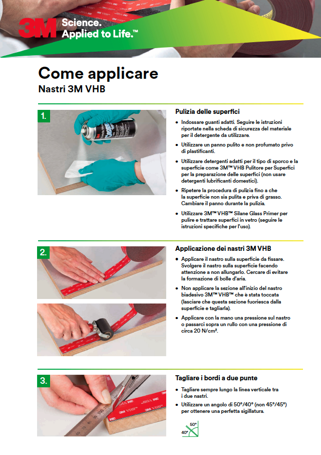 - Pulizia delle superfici conAlcool isopropilico aggiungere eventuale Primer 94 se la superficie lo richiede