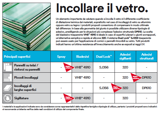 Un elemento importante da valutare quando si incolla il vetro è il differente coefficientedi dilatazione termica dei materiali, soprattutto nel caso di incollaggi di vetro su alluminio oppure vetro su legno: i prodotti proposti consentono di compensare in modo ottimale tali differenze. In base alla geometria del giunto è possibile utilizzare diverse tipologie di adesivo, prediligendo per le situazioni più complesse l’adesivo strutturale DP610. La scelta del biadesivo trasparente VHB™ 4910 è ideale in caso di superfici planari o giunti sovrapposti, un’alternativa semplice e rapida al silicone 320. Il sistema Dual Lock™ SJ356 trasparentepuò essere usato per l’applicazione di cornici o pannelli rimovibili su vetro. Tutti prodotti indicati hanno un’ottima resistenza all’invecchiamento anche se esposti ai raggi UV.